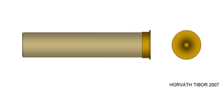 Központi gyújtású, sárgarézből készült peremes fenékrészből és impregnált kartonpapír palástból álló töltényhüvely, amelyet a