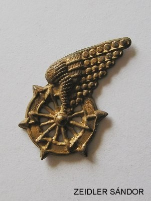 A fémlemezből sajtolt jelvény szárnyas vonatkereket ábrázol a közepéből kipattanó villámokkal,