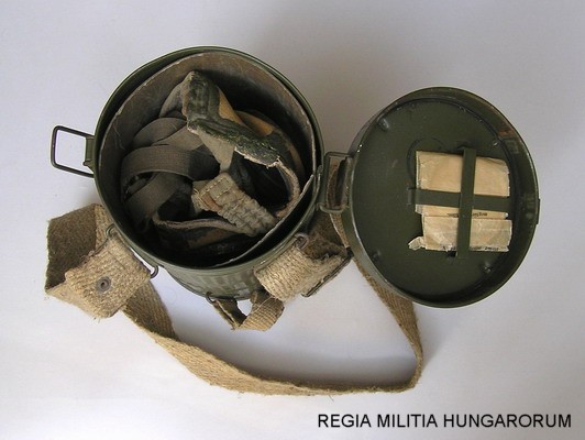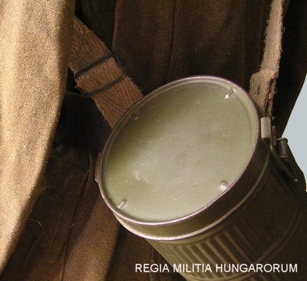 A háború végén jelent meg a némethez hasonló, belül kartonpapírral bélelt 42 M. bádog gázálarctartó