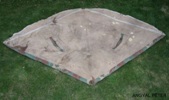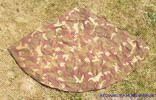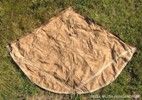 A 38 M. sátorlap egyharmad körcikk alakú, külső felén terepszínű vászonlap, rajta a sátorként vagy