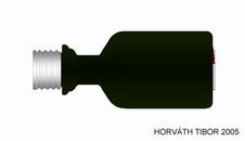 Csavaros alumínium kupakkal lezárt rövid nyakú zöld üvegpalack, amelynek fenekén téglatest alakú