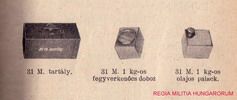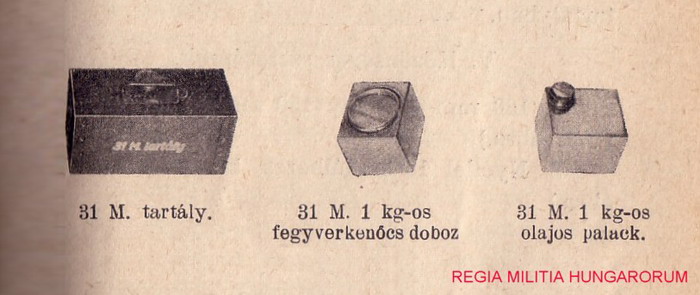 4 kg egységes olaj fér. Színe zöld, a golyószórókhoz rendszeresítetteken fehér "31 M TARTÁLY"
