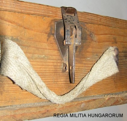 kidolgozású. Hordfogantyúja vászonhevederből készült, zsanér céljára két egyszerű vaslemez szalag